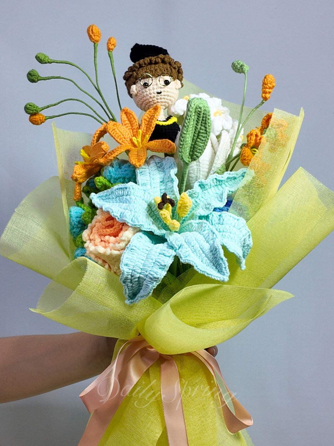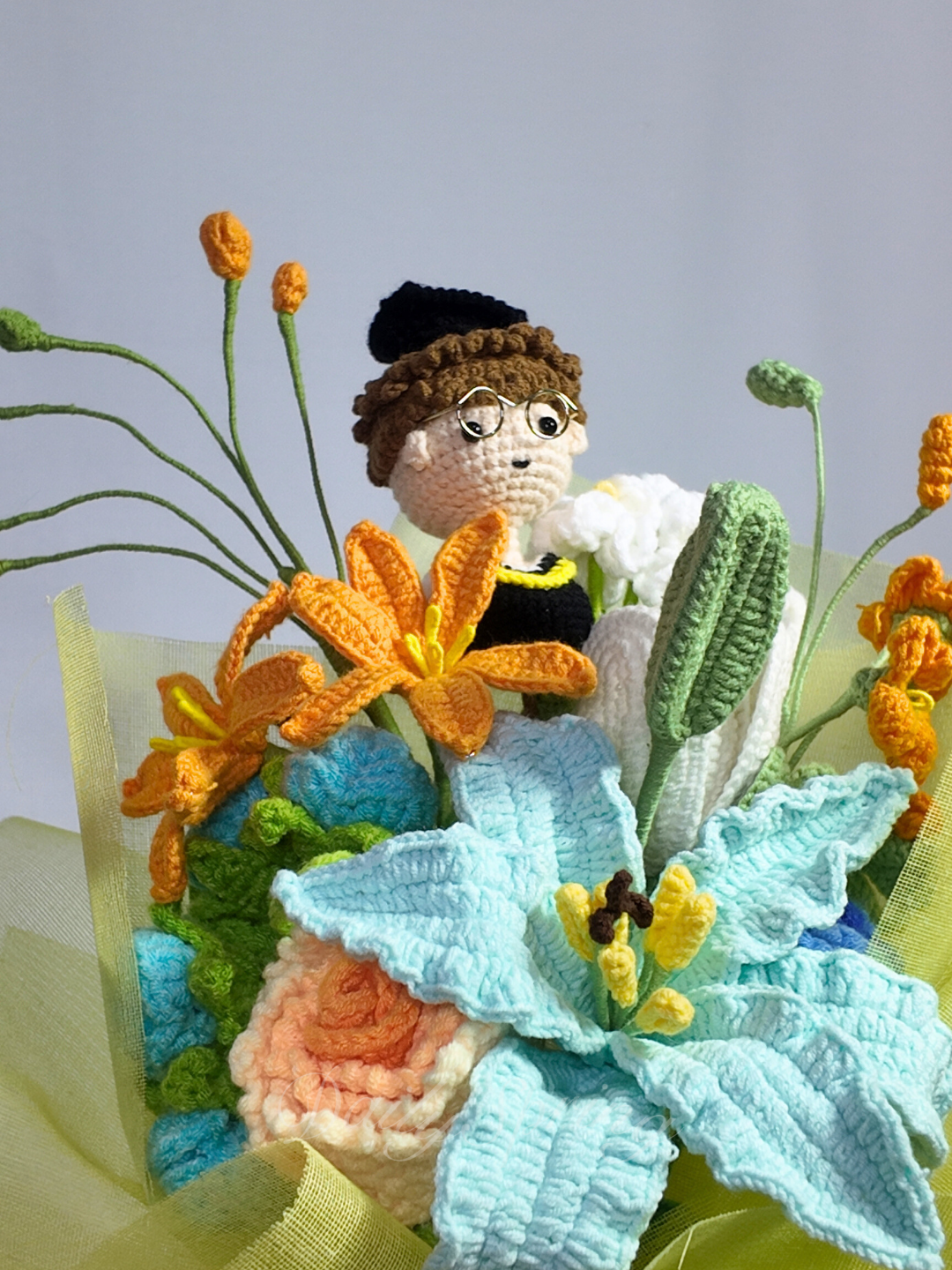 Anchored by a crocheted boy graduate doll in traditional cap and gown, this bouquet artfully blends scholarly blues and vibrant oranges. The addition of yellow garden roses infuses warmth and joy, while the sunshine-yellow wrapping echoes the optimism of new beginnings.