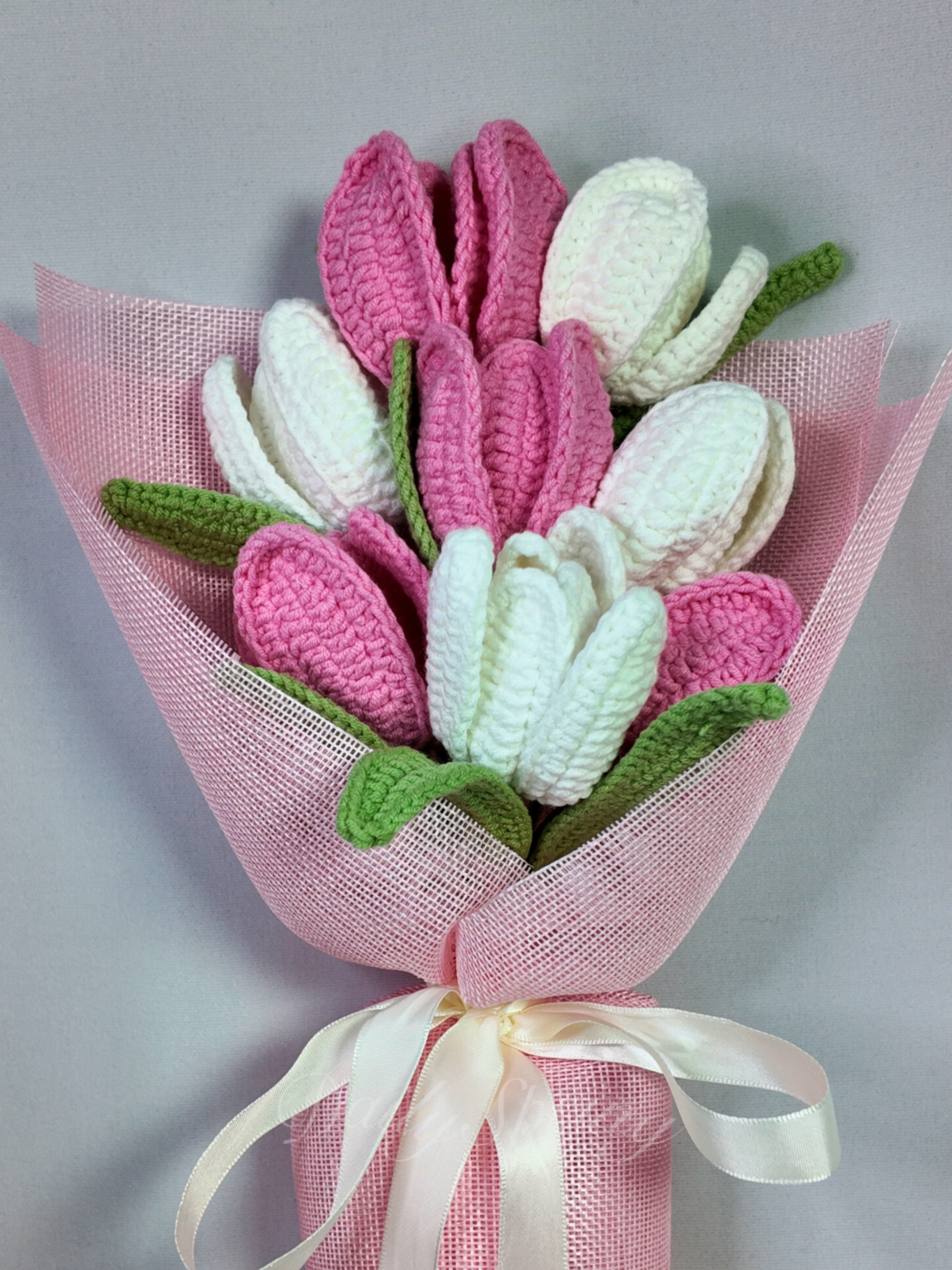 Tulips Bouquet with a graceful blend of handmade white and pink tulips. This elegant arrangement pairs soft neutrals with gentle blush tones, creating a bouquet that feels calm, romantic, and effortlessly timeless—thoughtfully crafted and made to last forever.